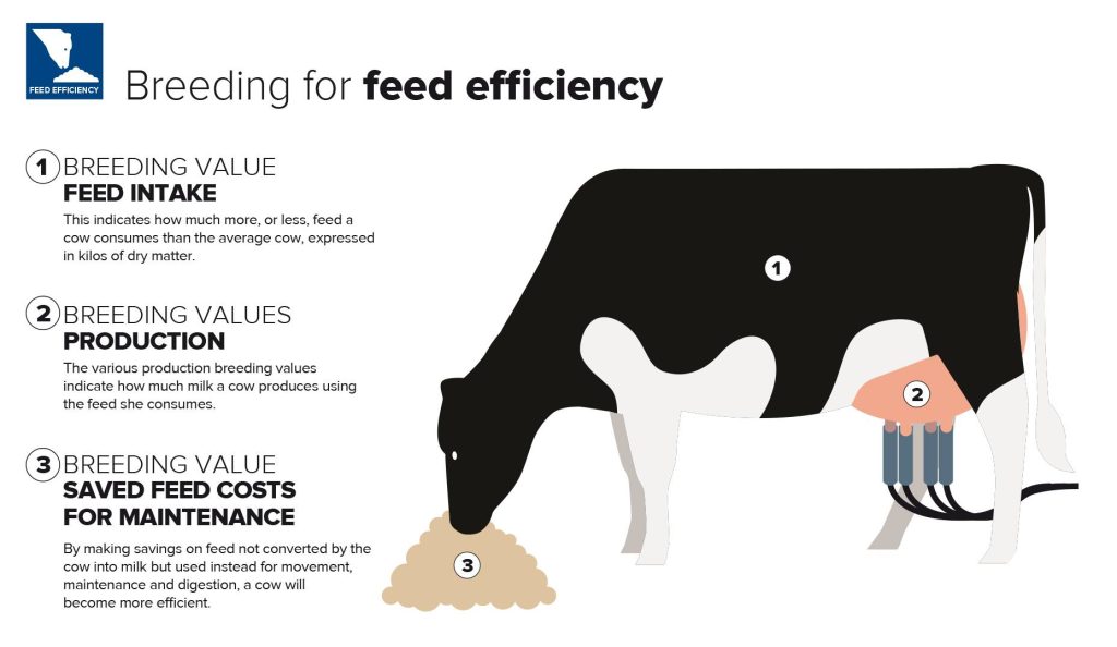 Breeding for feed efficiency: Including feed intake, production and saved feed costs for maintenance in your breeding program will allow you to breed more efficient cows and save feed. Feed efficiency is defined as the ratio of mean daily weight gain to mean daily feed consumption during a given period, with the feed conversion ratio (FCR) often used to represent the efficiency of converting feed into weight gain.